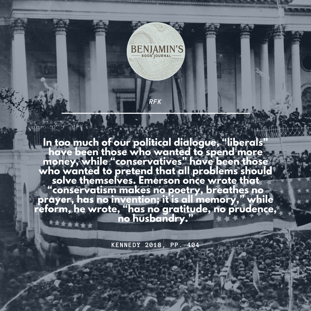 The new politics of 1968 has a final need: and that is an end to some of the cliches and stereotypes of past political rhetoric. In too much of our political dialogue, “liberals” have been those who wanted to spend more money, while “conservatives” have been those who wanted to pretend that all problems should solve themselves. Emerson once wrote that “conservatism makes no poetry, breathes no prayer, has no invention; it is all memory,” while reform, he wrote, “has no gratitude, no prudence, no husbandry.”