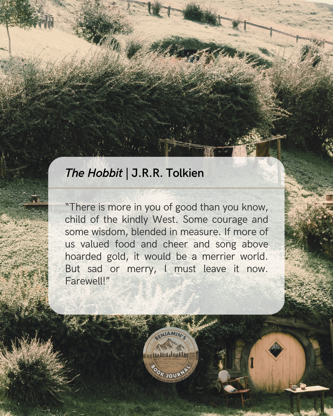 “There is more in you of good than you know, child of the kindly West. Some courage and some wisdom, blended in measure. If more of us valued food and cheer and song above hoarded gold, it would be a merrier world. But sad or merry, I must leave it now. Farewell!”